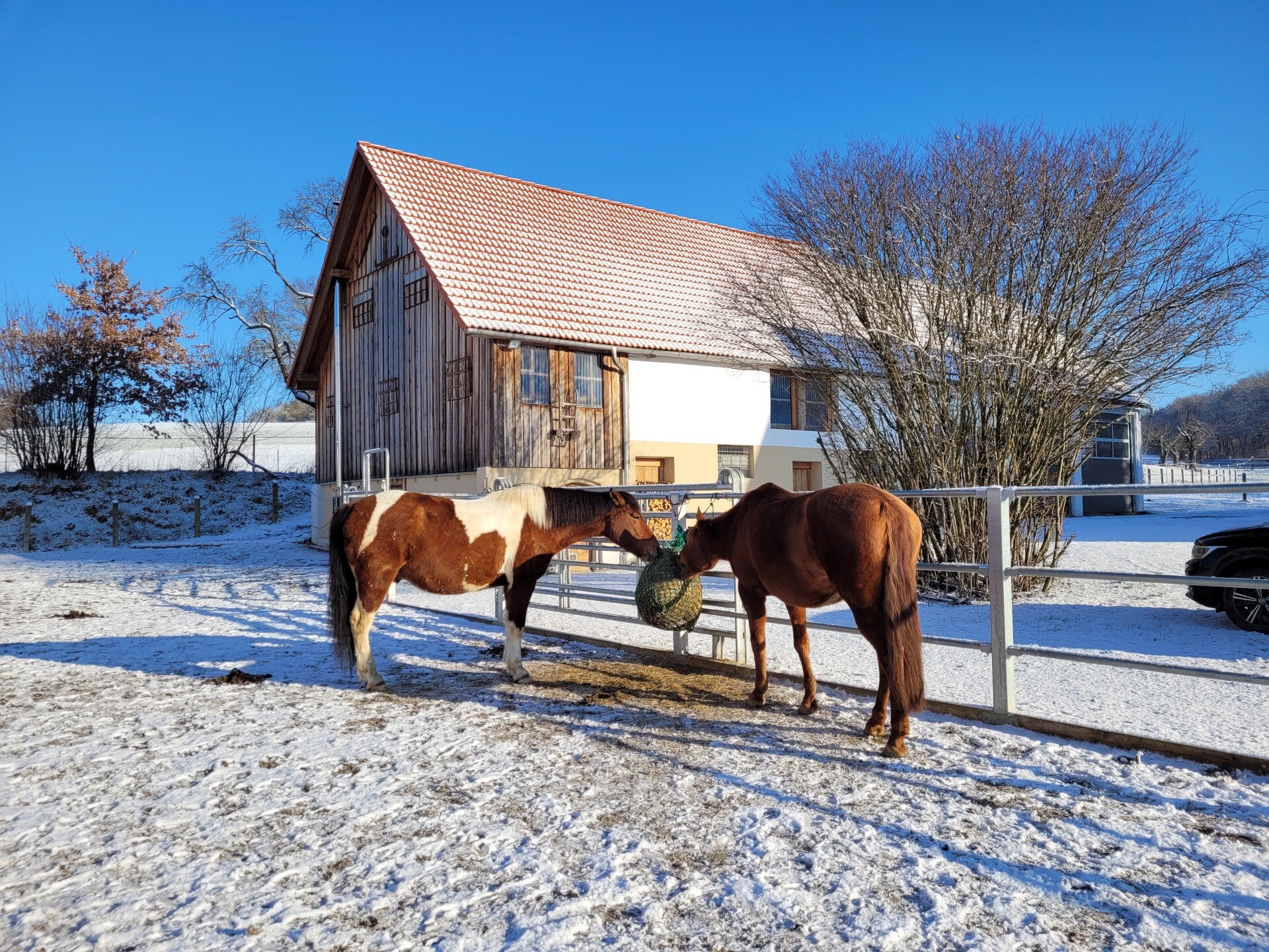 In unserem Stall in Katzenthal bei Affing haben wir momentan acht Pferde. Diese genießen viel Platz in unserem großen befestigten Paddock mit 24/7 Heu aus eigener Produktion und viel Platz auf den Koppeln. Unser neuer, schöner 20mx40m Reitplatz ist das ganze Jahr benutzbar.